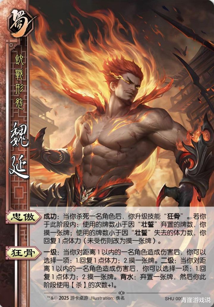 如果势魏延击杀一名角色,则进入第二形态,先升级【狂骨】到二级,并根据自身失去牌、体力值,对比使用过的牌,获得摸牌与回血效果。二级【狂骨】可以弃置一张牌,然后出杀的次数+1。